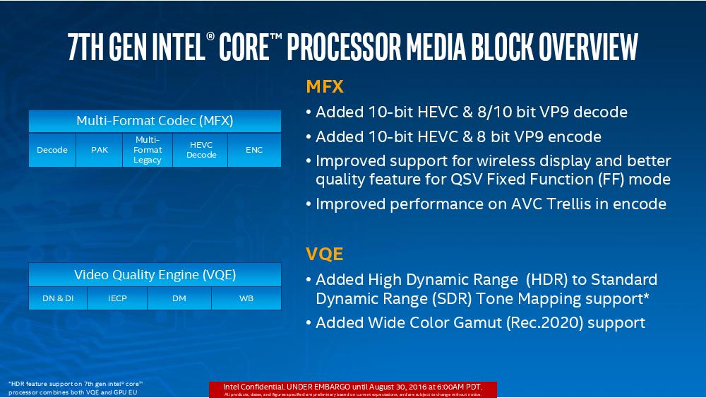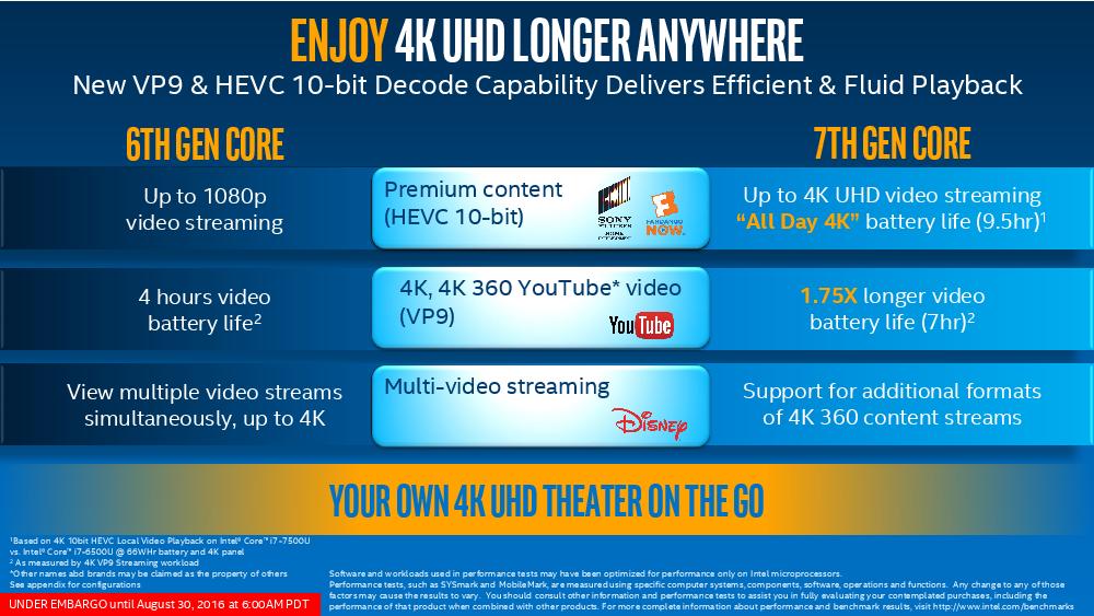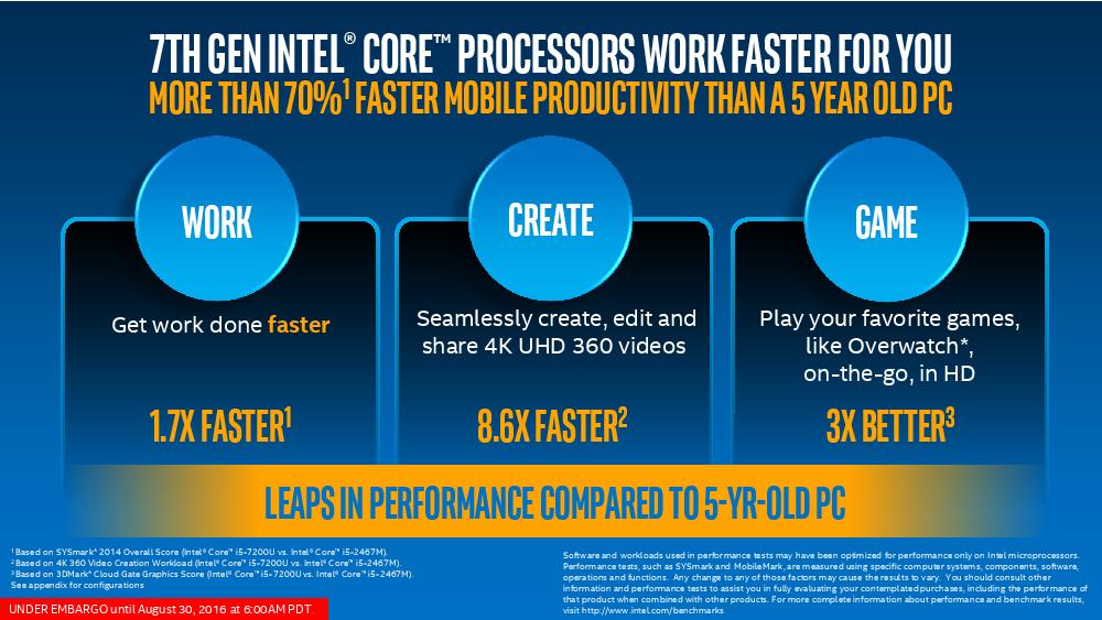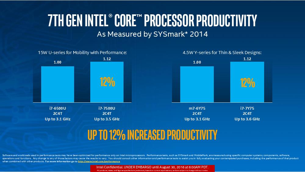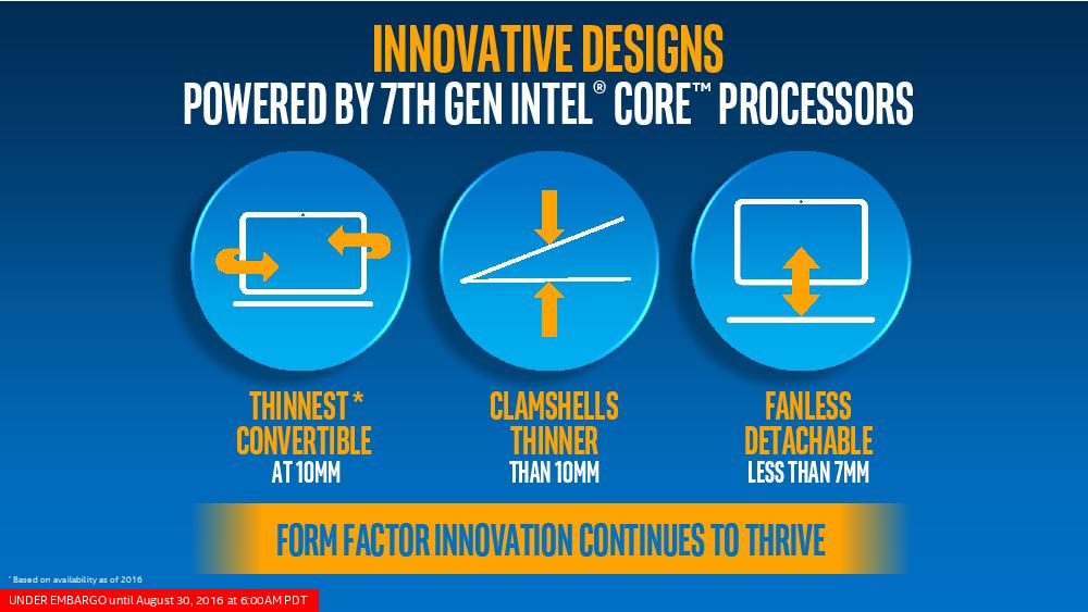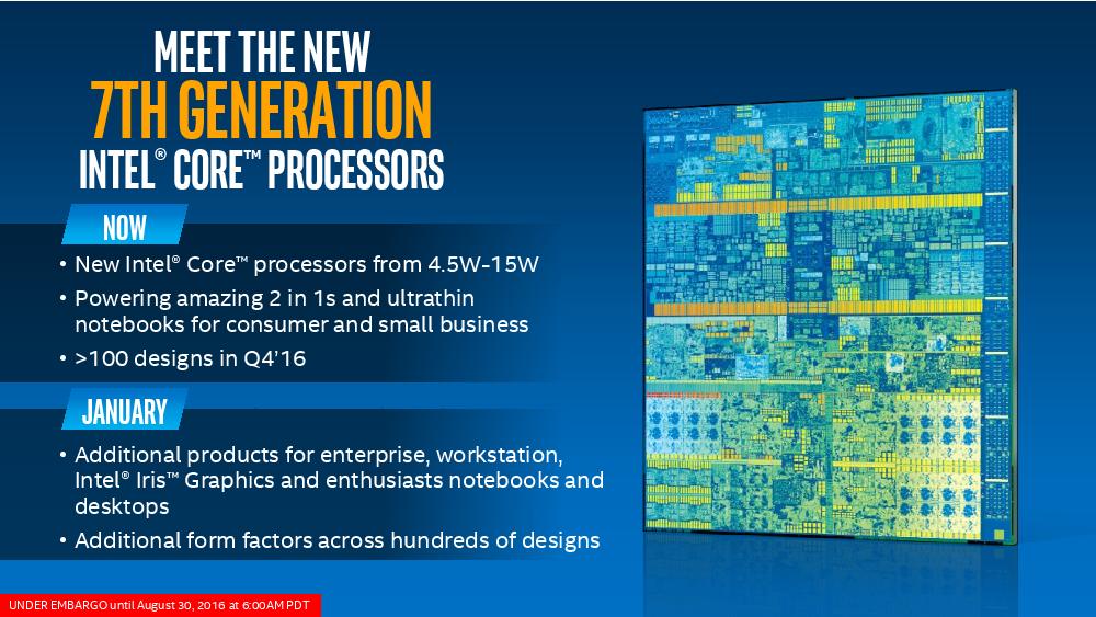 Intel第七代Core处理器正式解禁,一如当初发表第六代Core的情况,也是由着重省电的版本先行推出,首波将是以仅4.5W-15W的Y系列与U系列打先锋,目标市场是2 in1与超薄笔记本电脑,而针对企业、工作站等笔记本电脑与台式电脑高性能版本则要到2017年一月份才会登场。 Intel也预计今年底前市场将出现100款以上的U系列与Y系列第七代Core产品。