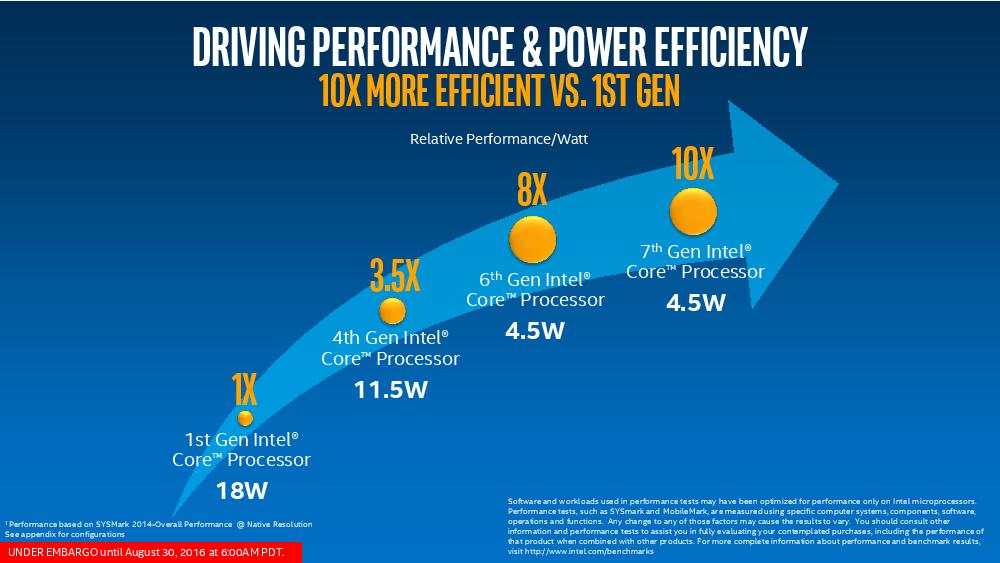 Intel以一张图片说明第七代Core的进化,从最早的第一世代的TDP极限落在18W,虽然此代相较第六世代的TDP都是4.5W,然而性能仍有提升,同时相较第一世代提升的幅度高达10倍(不过主要是因为GPU而来…)。