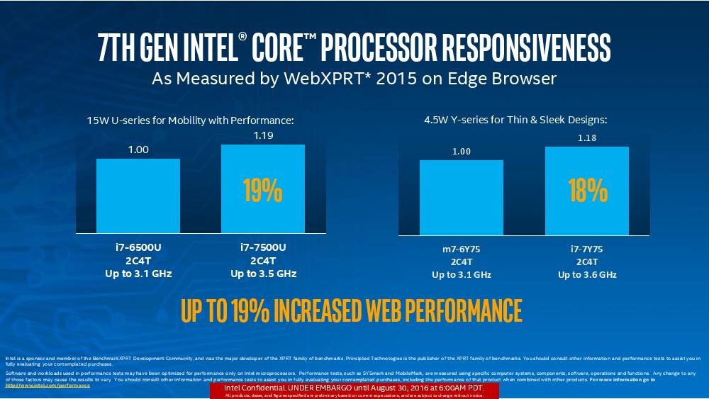 Intel也利用两款测试软件比较第六代与第七代U系列与Y系列最高性能版本在生产力与网络浏览的性能提升幅度,可看到第七代的i7-7500U的时脉已经冲上3.5GHz,相对前一代网页浏览提升19%,生产力提升12%。至于4.5W的i7-7Y75的性能相较前一代m7-6Y75在网页浏览也有18%的性能提升,生产力则提升12%,时脉也突破3.6GHz。