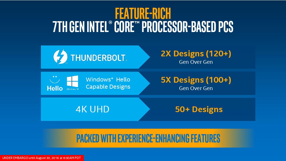 提升使用者体验方面,Intel也提出第七代机种相较前一代具备的先进技术的搭载成长,像是有越来越多的机种搭载Thunderbolt(毕竟目前Thunderbolt 3也直接通过USB Type-C以Alt Mode整合了…),还有搭载Windows 10 Hello生物辨识技术,以及支持4K UHD等。