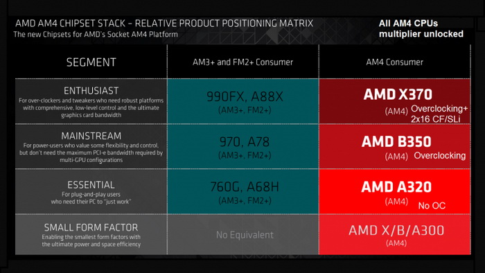 AMD之前公布的AM4平台路线图中并没有介绍具体的规格,现在Planet3D网站拿到的官方PPT完整度更高,详细介绍了不同市场的芯片组及主要规格: