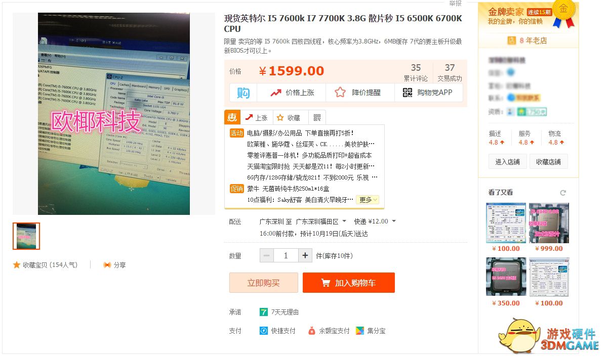 虽然到明年一月份Intel七代酷睿桌面版才会正式上市,但在神秘的东方国度一切皆有可能,在万能的淘宝已经有商家开卖!并配合Z170主板升级最新BIOS成功点亮。而且截至目前已经有了35个累计评论!