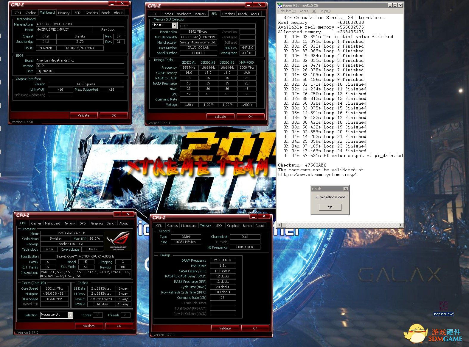 Super PI是一个计算圆周率精确到小数点以后的指定数位(最大3200万)的计算机程序,它被全球超频玩家公认为测试电脑性能及稳定性的准绳。在该项目中,选手同样将内存超频优化至4276MHz C12-11-11-28 240 1T,获得4′57.531″的优异成绩。