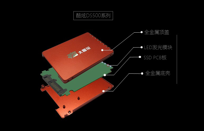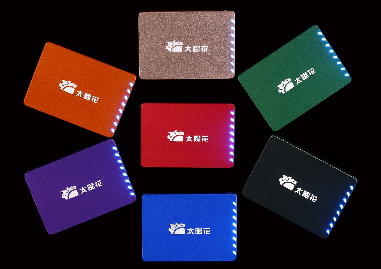 据了解,这系列的SSD除了能发光外,在外观和用料方面更是诚意满满。对SSD稍有了解的人都知道,挑选一款性能相当的SSD主要看主控,闪存颗粒、以及容量等性能参数。太阳花DS500系列目前上市的有128GB和256GB两个版本;为追求极致,太阳花还为我们带来红、橙、绿、蓝、紫、金和黑七种颜色选择。