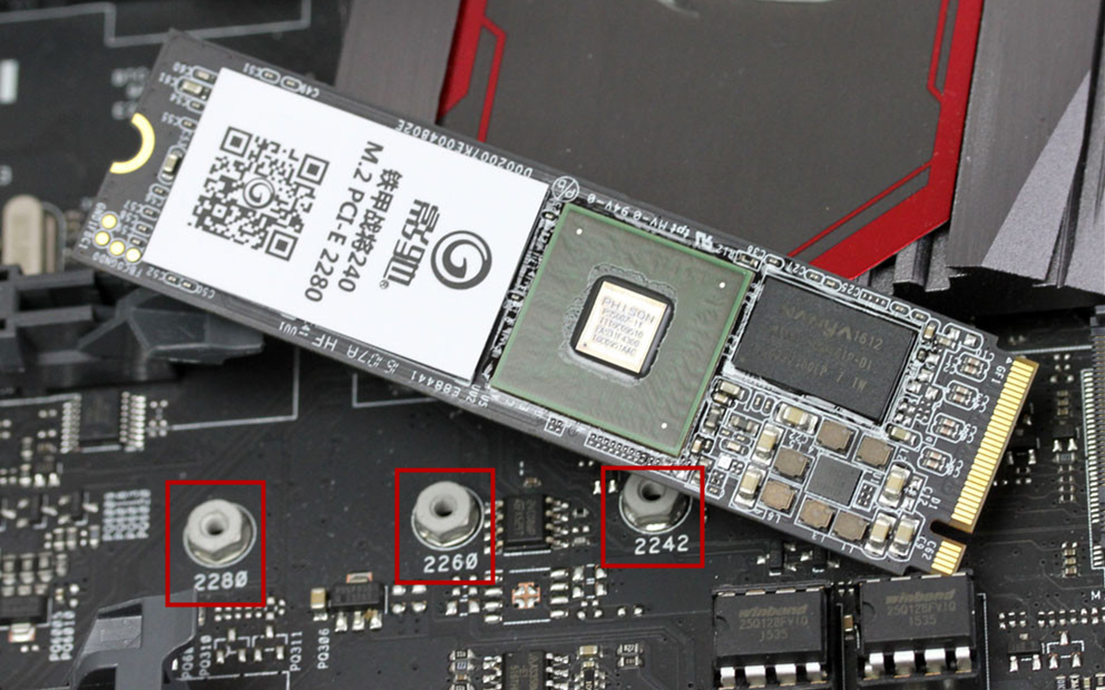 RT,在你主板M.2接口的位置,清晰可见2280/2260/2242,或是80/60/42字样,甚至只有三颗光秃秃的螺母,它们表示主板所能安装M.2 SSD常见的三种长度尺寸。
