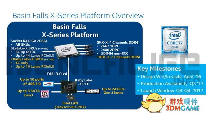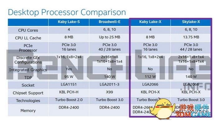 Benchlife早前爆料过Kaby Lake-X和Skylake-X处理器的规格,KabyLake-X系列是4核架构,8MB L3缓存,支持16条PCI-E 3.0通道,无集成显卡,TDP功耗为112W,搭配KabyLake PCH-X芯片组,支持Turbo Boost 2.0,支持双通道内存,最高频率提升到DDR4-2666。