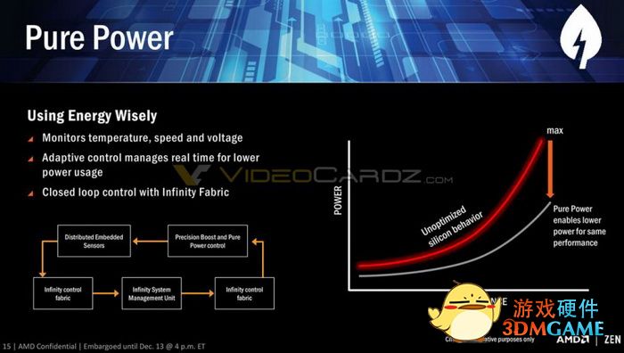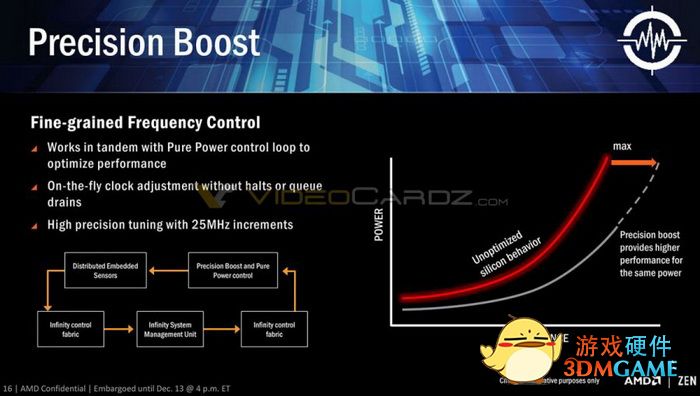 Zen处理器支持Turbo加速技术没什么意外的,不过现在的频率加速技术更强大,属于细粒度频率控制技术,AMD称之为Precsion Boost加速,配合下面的Puere Power可以优化性能,精确控制到每25MHz精度控制频率。