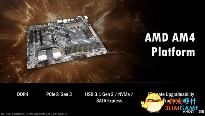 Zen处理器会搭配新一代AM4平台,之前我们也介绍过多次了,其中会分为X370、B350、A320等等不同系列,支持DDR4内存没跑了,支持原生PCI-E 3.0,还有USB 3.1 Gen2、NVMe及SATA Express等,具备超高的扩展性及升级性。