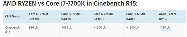 Ryzen的频率信息看不到,最终跑出了1188cb,明显好于Kaby Lake i7-7700K的默频甚至超频到5GHz,但距离i7-6900K/6950X仍有差距。