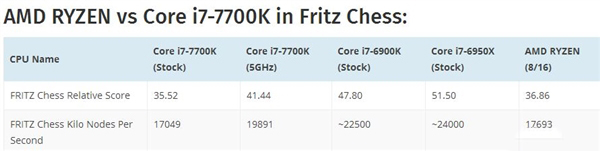 象棋测试,微微领先默频的i7-7700K,但远不如超频5GHz的前者,和6900K/6950X差距也大。