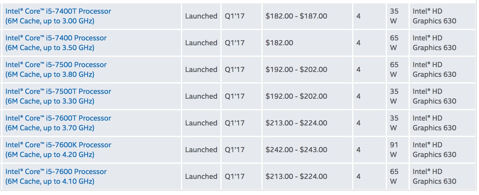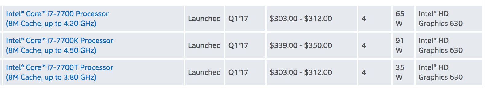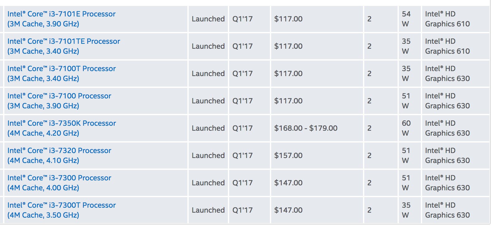 此次更新处理器产品,分别包含四款Core i7系列、七款Core i5系列,以及八款Core i3系列规格,其中Core i7、Core i5均采用四核心设计,仅Core i3系列采用双核心构架,但额外加入一组双核四线程、采无锁倍频设计的Core i3-7350K,让入门玩家也能体验超频乐趣,至于此次更新的桌面款处理器建议售价分别介于117美元至350美元区间。
