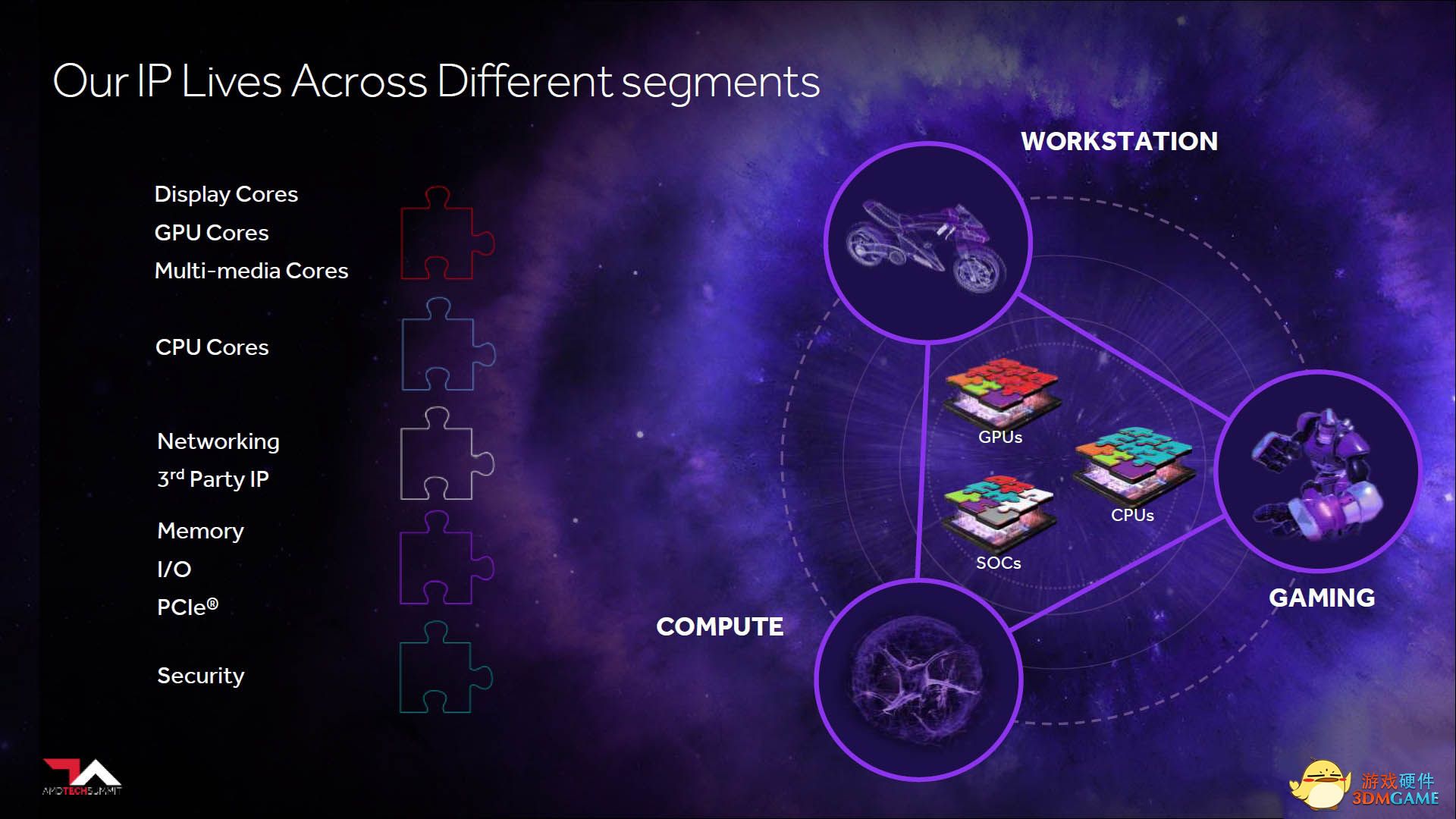 AMD将IP模块分为显示、GPU、多媒体、CPU、网络、三方IP、内存、I/O、PCIe、安全等,无论是处理器还是图形卡抑或者SoC片上整合方案,可根据需要进行搭建(Infinity fabric)。