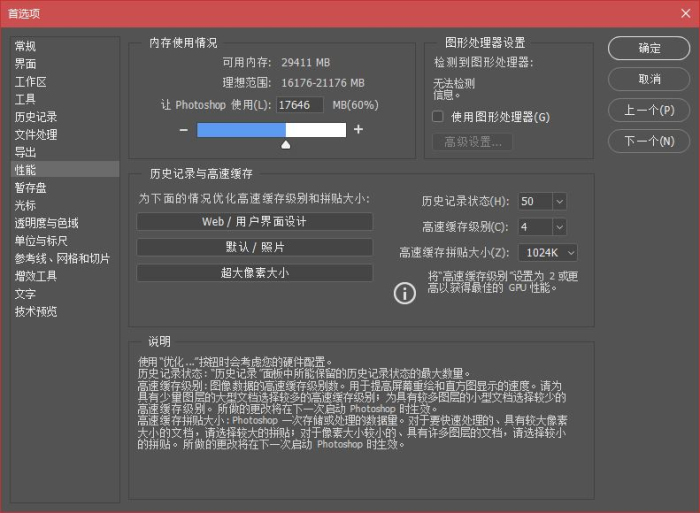 在Photoshop 软件设置中,我们可以选择内存占用比率,也就是当你指定百分比内存占用率的之后,当这些内存空闲的时候你最多可以有对应你设置比例的利用量。比如上面我们用两条FURY DDR4 2400内存,两条16GB内存插入主板中。我们在Photoshop中选择60%占用率,这个时候可以留给Photoshop软件最多高达17GB的高速处理空间。