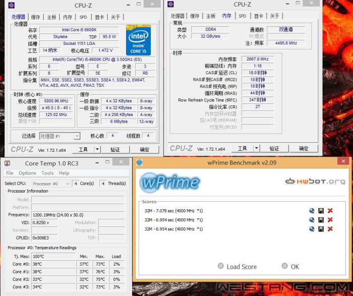 HyperX FURY DDR4 2400 16GB×2 配合6600KCPU超频wPrime跑分