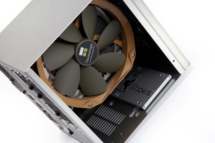 “玩家任性自有道理”这句话看来说的没错,下图的这套曾经的小钢炮CPU搭配的是赛扬G1610,没看错,是赛扬G1610,一款ITX板型的B75,散热器用的是下压版旗舰ThermalRight AXP200,搭配的也是ThermalRight零售款最大的一只风扇——TY150,而这又近乎极限地刚好塞进这个JONSBO V2的紧凑机箱中,看到这里各位可能好奇这套主机的电源是什么了吧!可能有些玩家朋友已经猜到了,这是DC-ATX方案的模块电源,在主机内部只有一个24pin+4pin的直插DC-DC模块,功率为120W,这套平台可以平时待机功耗不超过20W,开下载或者当客厅机也不过30W以内,关键是非常静音。
