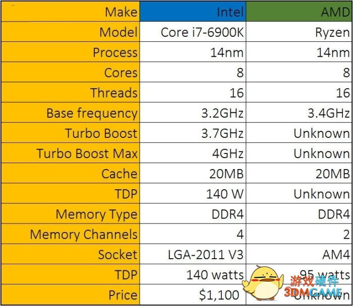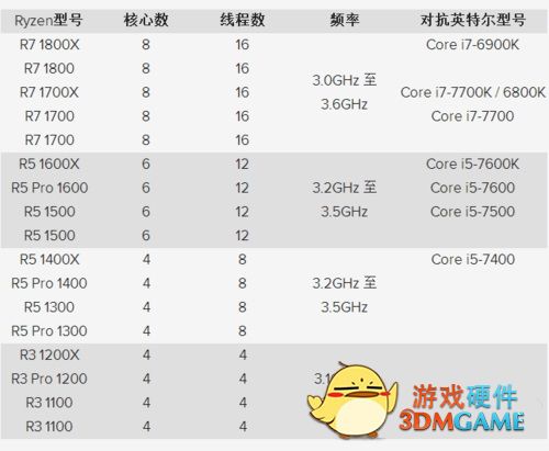 本月,台湾沧者极限论坛还归纳了AMD Ryzen的17款型号,包括8核R7、6核R5以及4核R3,其中R7 1800X对标i7-6900K,但前者功耗只有95W。