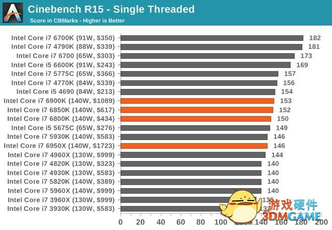 性能方面,以CineBench R15来看,单线程性能中规中矩,但多线程绝对无敌,i7-6950X得分已经突破1800,i7-6900K也大幅度领先i7-5960X 20%之多,i7-6850K/6800K也都超越了i7-4960X。
