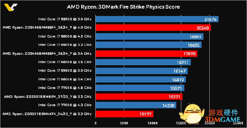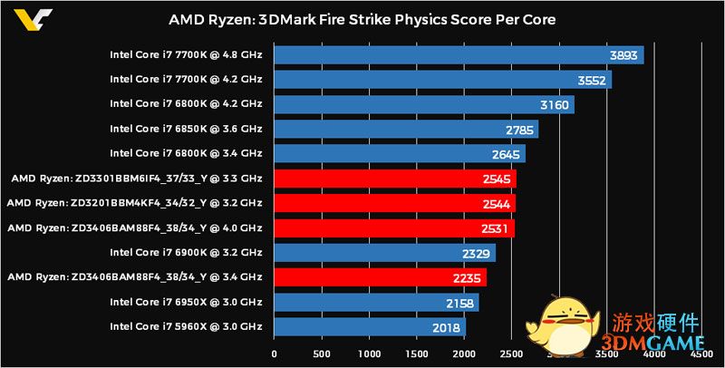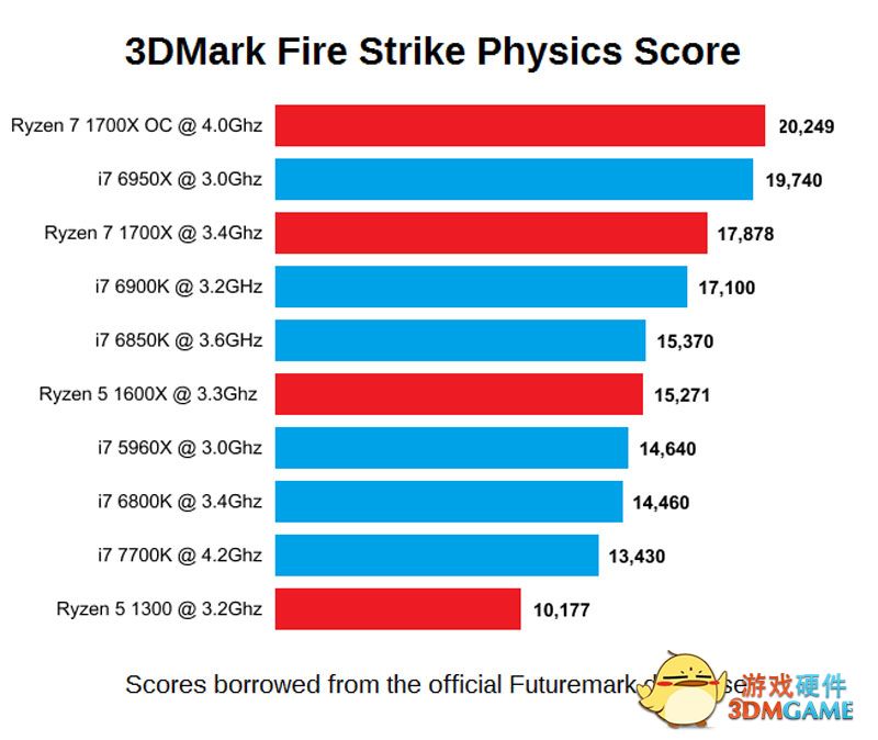本次泄露的是3DMark Fire Strike Physics的成绩,主要是测试CPU的渲染能力,支持多线程。大家可以看到8核16线程4GHz主频的AMD Ryzen处理器的成绩超过了6和12线程4.2GHz主频的i7 6800K,只比10核20线程3GHz的i7 6950X低6%!成绩有点彪悍。