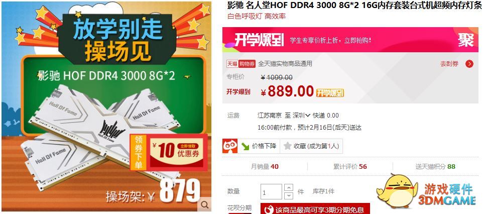诞生于2010年的影驰名人堂系列凭借纯白外观和顶尖超频性能,已经成为了DIY群体中家喻户晓的品牌。如今,影驰名人堂在DDR4内存领域发起攻势,继推出打破多项超频记录的4000MHz超高频率之后,面向中端用户的3000MHz HOF 内存再次亮剑!这套HOF纯白信仰内存在开学季优惠至889元,感兴趣的朋友快去入手吧!