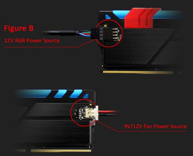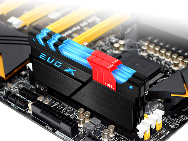 Geil最新的旗舰EVO-X DDR4搭载了RGB LED,可与华硕ASUS Aura、华擎ASRock Aura、微星MSI Mystic Light Sync及技嘉GIGABYTE RGB Fusion进行LED同步,内存上有两个输入连接埠,各在两侧的地方,一个可支持4-pin RGB LED插槽,另一个则是9V / 12V电源连接埠,可连接风扇接头。