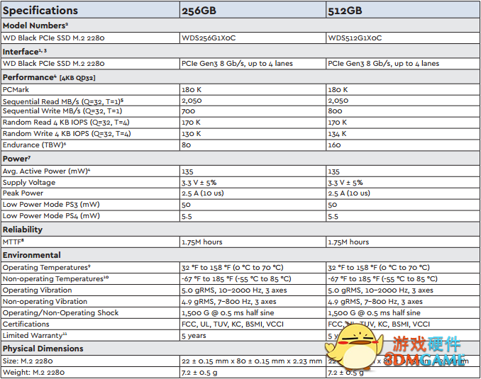 性能有了,那么寿命怎么样?西数官方宣称Black PCIe SSD平均无故障运行寿命为175万小时,总数据写入亮分别为256GB的80TBW和512GB的160TBW,提供5年有效质保。