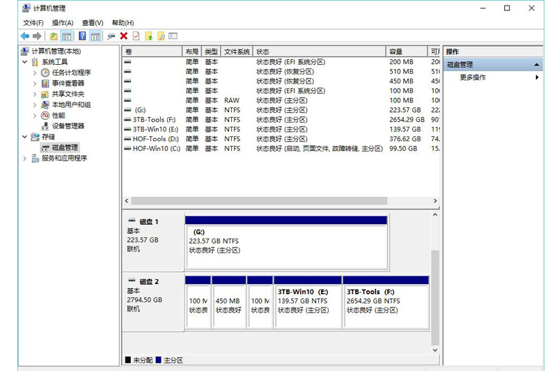 正确连接好硬盘,经过简单的设置后,通过计算机管理可以看到硬盘已经被正确识别,可用容量为223.57G。
