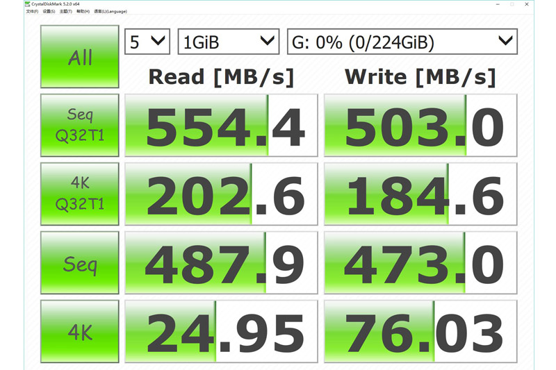 在CDM测试中,金士顿A400 SSD连续读写速度达到了554.4/505 MB/s,而4K随机读写速度也达到了24.95/76.03 MB/s,超出了SS D平均水平,这个成绩也足以说明金士顿A400 SSD虽然定位入门,但其自身素质已完全超出了入门产品的水准。