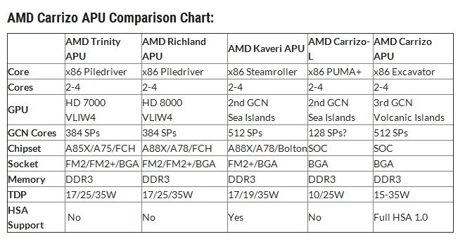 六代AMD Carrizo发布于2015年6月的台北电脑展,首波移动处理器有15W和35W两种功耗设计,包括AMD A10-8700P、AMD A8-8600P、AMD A6-8500P等。