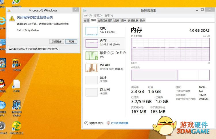 拥有4GB内存容量的电脑运行使命召唤OL也会提示内存不足,实际上后台应用程序占用也并不是很多,但游戏会出现峰值占用内存的波动,这样就很有可能出现上述游戏或者应用程序突然中止的情况,这是多么让人不开心的情况啊。