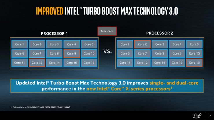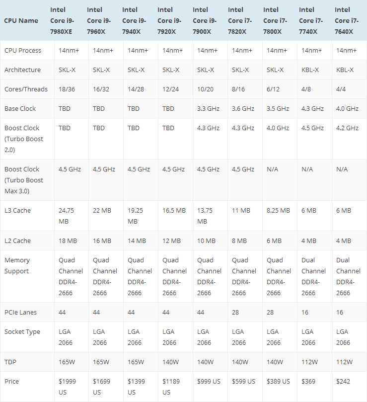 i9-7980X有18个核心和36个线程以及英特尔的Turbo Boost Max 3.0技术 ,Boost频率可以高达4.5GHz(主频目前犹未可知)。CPU的L2缓存具有18M(每核心1 MB),L3缓存为24.75 MB。支持四通道DDR4最高2666 MHz。位于LGA 2066这种高能平台上,i9-7980X的TDP仅165w。