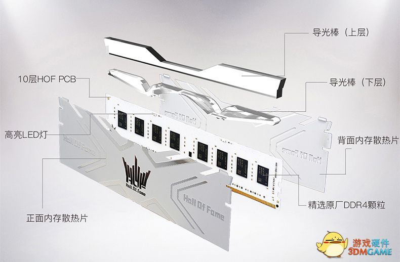 HOF DDR4内存承袭影驰名人堂系列尊贵纯白血统,白色信仰倾注在内存的细节之中,白色散热板,延伸到内存条的上侧。散热板正面的线条形成了“X”标志,簇拥着名人堂的LOGO。