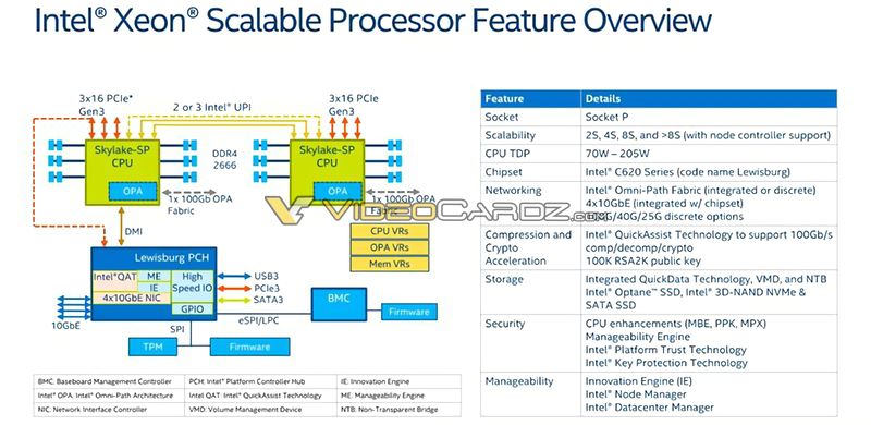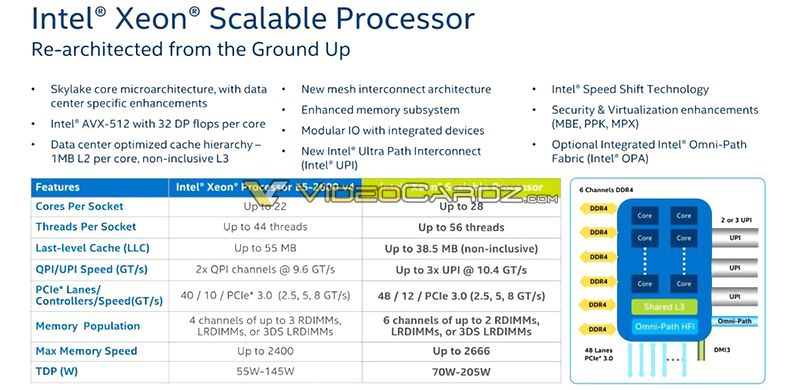 在VideoCardz上出现了一则超独家消息,虽然只闻其图,不见其文,不过没关系,还是让我们一起来看一下Intel的Skylake-SP处理器:它将会搭载28核心56线程,并拥有38.5 MB的大LLC内存,还内置48个PCIe 3.0通道,这个处理器也支持6通道RAM与2666MHz的2 x RDIMMS、LRDIMM(或3DS LRDIMM),功耗约会在70W到205W之间,笔者觉得这范围好像…有点大?