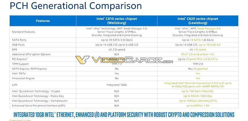 处理器C620系列芯片将会有14个SATA 3接端口、14个USB 2.0端口以及10个USB 3.0端口,它甚至也能支持4个10GbE网络连接埠。