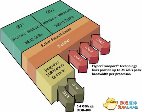 ▲当年AMD Athlon X2利用Crossbar将2个处理核心和內存控制器总线串接在一起。