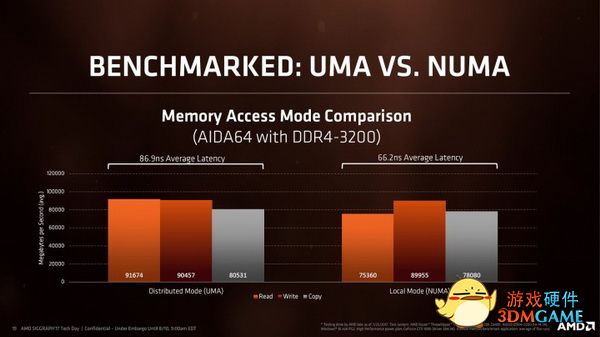 由于NUMA存取不同位置的记忆体会有不同速度的特性,软体(无论是作业系统或是应用程式)必须要特地为NUMA最佳化,才可以提供最佳的运作性能。若是程序运作时需要较大的內存频宽,则需最佳化成Distributed Mode,反之对于內存存取延迟较为敏感,则变更为Local Mode。依据AMD释出的资料,Ryzen Threadripper的Distributed Mode频宽大约多出0.56%~21.65%,Local Mode延迟减少约23.82%。