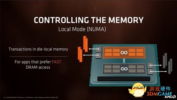 回到AMD Ryzen Threadripper的讨论,该处理器内部启用2个晶粒,单一晶粒分别连结双通道四组记忆体模组插槽,合并起来就是四信道八组记忆体模组插槽。由于內存分属不同的总线,所以是NUMA架构,具备2个节点(1组总线所连结的处理器和內存),这在家用市场(或是更精细的说:HEDT市场)可谓首见。