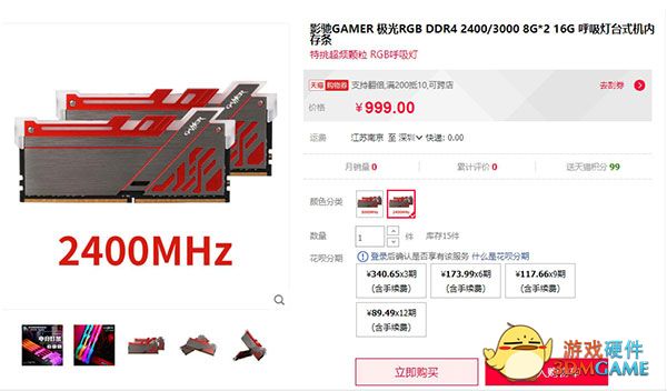 目前影驰GAMER 极光RGB DDR4-2400 8G*2内存套装正在天猫影驰铭索顺专卖店热卖,售价999元,对性能和颜值有较高要求的玩家可要早下手。