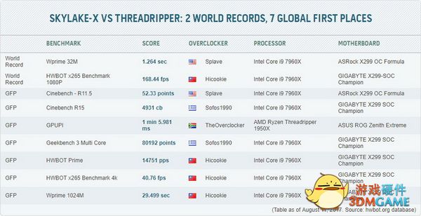Spline(Intel Core i9-7960X 5.60 GHz超频)在CineBench R11.5中取得52.33分;Sofos1990(Intel Core i9-7960X 5.60 GHz超频)在Cinebench R15中的4931分;TheOverclocker(Ryzen Threadripper 1950X 5.4461GHz超频唯一上榜的)在GPUPI中为5.981 ms。