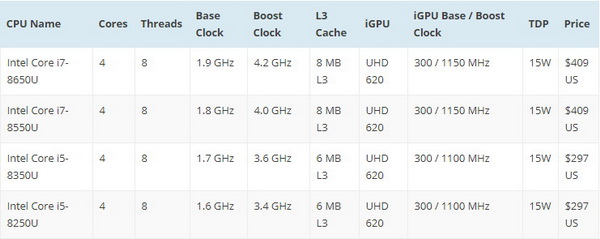 英特尔第8代15W TDP移动CPU阵容中包括4个SKU,包括Core i7-8650u、i7-8550u、i5-8350u和i5-8250u。第8代处理器相较于第7代的优势是很明显的,虽然Kaby Lake Refresh处理器没有架构上的变化,但4核心8线程的规格是上一代的两倍,在相同的15W TDP下却有更快的图形引擎。