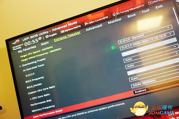 进入BIOS之后我们可以直接在CPU与内存频率调节界面开启D.O.C.P技术,这也是类似Intel XMP的一项内存频率增强技术,在不同的设定下给予用户选择内存可以适应的最高频率选项,对于HyperX Predator DDR4 3600这套内存来说我们当然要选择最高的3600频率。其他设置就非常简单了,时序不要我们来调节,Predator系列内存内置了针对不同指定频率下的对应稳定时序。