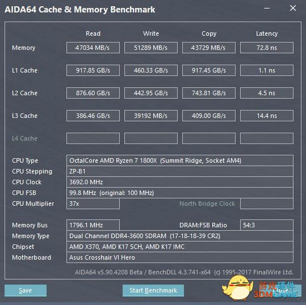 我们用AIDA64进行一下内存带宽吞吐测试,比起之前稳定的DDR4-2400的频率,DDR4-3600整整提升了1200MHz等效频率,在读取带宽方面也达到了47GB/s的读取带宽,51GB/s的写入带宽,表现非常强劲。这样的性能水平可以说是Ryzen 7系列处理器平台玩家真正需求的性能。