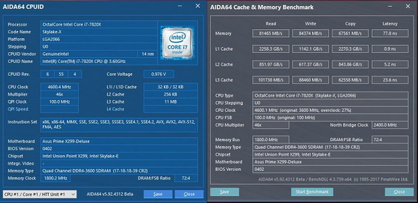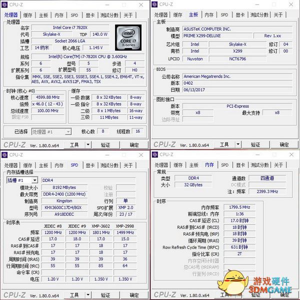 在本次实战X299平台的体验方面,我们搭配了Intel i7 7820X处理器,作为目前Intel桌面i7的Skylake X架构方案的旗舰方案,8核心16线程最高睿频达到了4.5GHz,在四通道内存的加持下相信性能也会表现很好。本次试用的是HyperX Predator DDR4 3600四通道套装,可以说是为X299这套平台无论是内存组合上还是频率上都是量身定做。