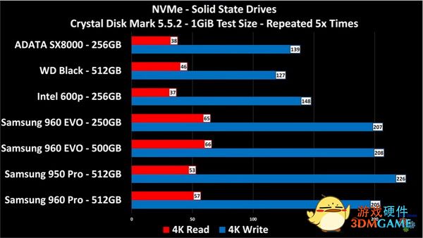 下面我们挑选了目前市面上最好的几款NVMe固态硬盘进行测试,分别为ADATA SX8000、WD Black、Intel 600p、Samsung 960 EVO、Samsung 960 Pro、Samsung 950 Pro。