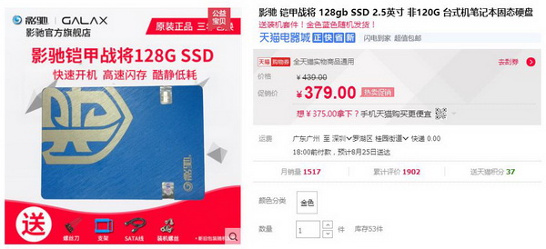 影驰 铠甲战将 128G自推出市场以来,凭借卓越的性能和超低的价格深受用户的推崇。目前其正在天猫影驰丽泰专卖店促销优惠,只售379元!