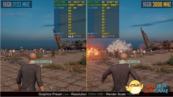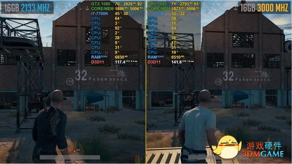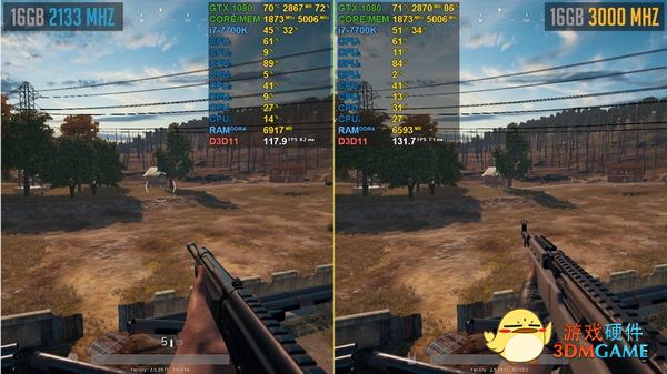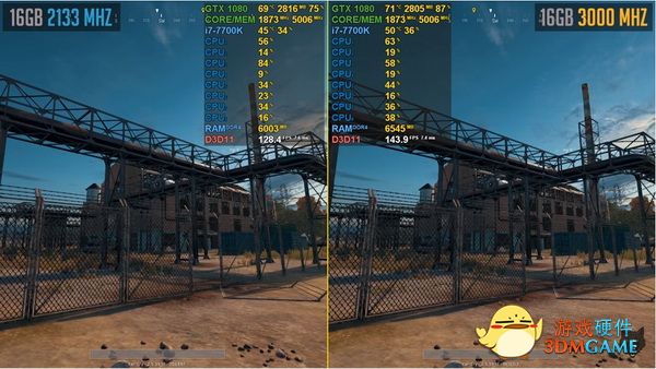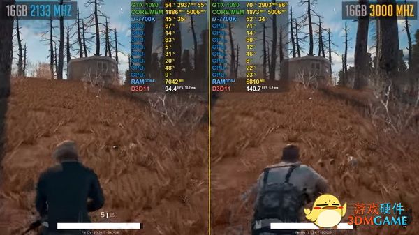 在《绝地求生》游戏画面里,细节丰富,场景繁杂的情况下,2133MHz和3000MHz的频率下成像效果相差非常大,最高有接近50FPS的差距。高频的内存能带来更为流畅的吃鸡体验