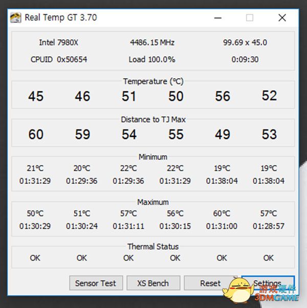 开始测试CPU的性能时,最低温度持续20度左右,最高温度达到了55度左右。过去了40分钟也并没有很大的温度起伏,平静如水相当顺畅,性能强大的X系列从图可以得知完全搓搓有余嘛,像X战警一样打得对手落花流水一般。这叫AMD情何以堪!