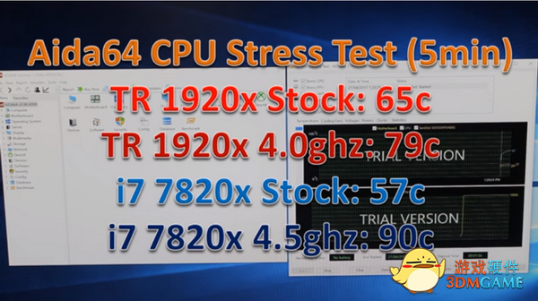 空载时1920X的温度略高于i7 7820X,分别为65度和57度;而满载情况下,i7 7820X的温度就飙升到了90度,1920X则保持在79度左右。由此可以看出i7 7820X的功耗相当大。