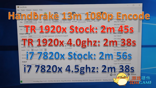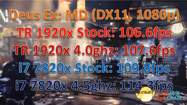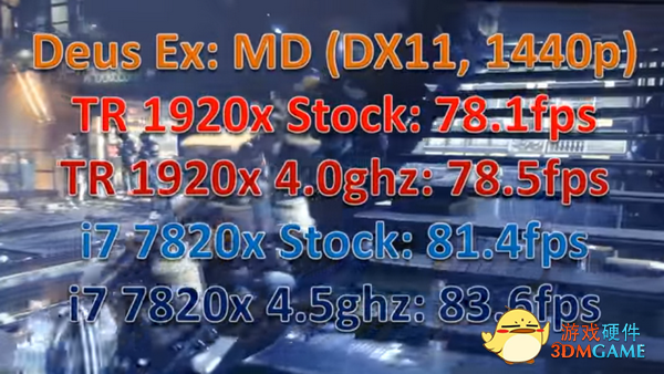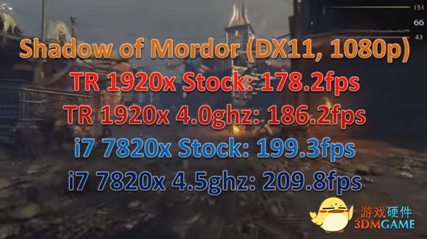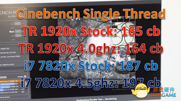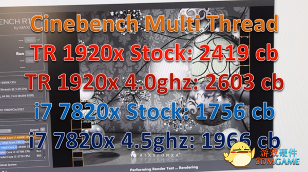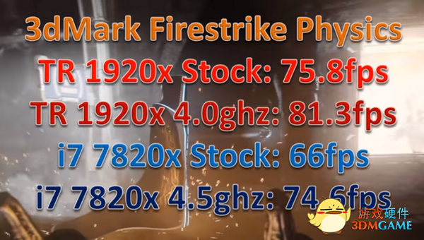 在3Dmark测试中1920X最低的75.8fps都高于i7 7820X最高的74.6fps,取得了碾压性的胜利。