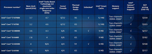 先前有关于Intel第八代桌上型Core i系列处理器(代号Coffee Lake-S)的谣言满天飞,而该公司终于将10月初即将开卖的6款处理器型号和规格公布。首先开卖的Core i3、Core i5、Core i7各有2款型号,1款一般版本1款则为K版,依序为Core i3-8100、Core i3-8350K、Core i5-8400、Core i5- 8600K、Core i7-8700、Core i7-8700K,详细规格请看下图: