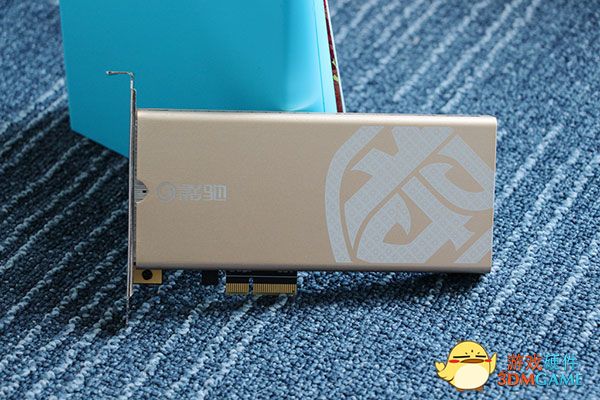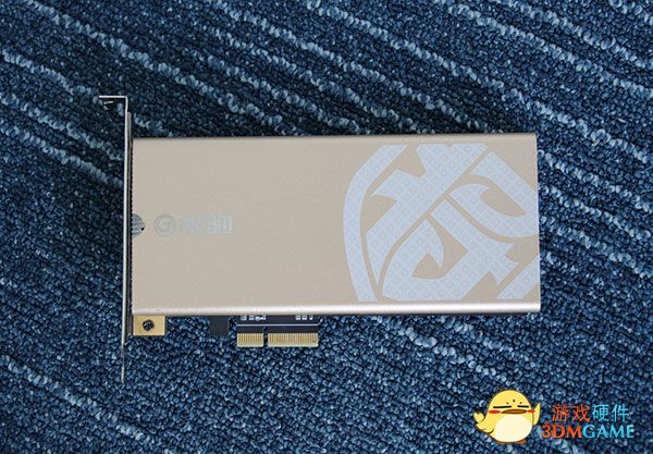 铁甲战将PCI-E AIC SSD采用半高的PCI-E拓展卡规格,形似轻薄化的独立显卡。金色散热铝板经阳极氧化处理,细腻之中彰显质感。覆盖在散热铝板的将系列LOGO表明了该款SSD的身份。